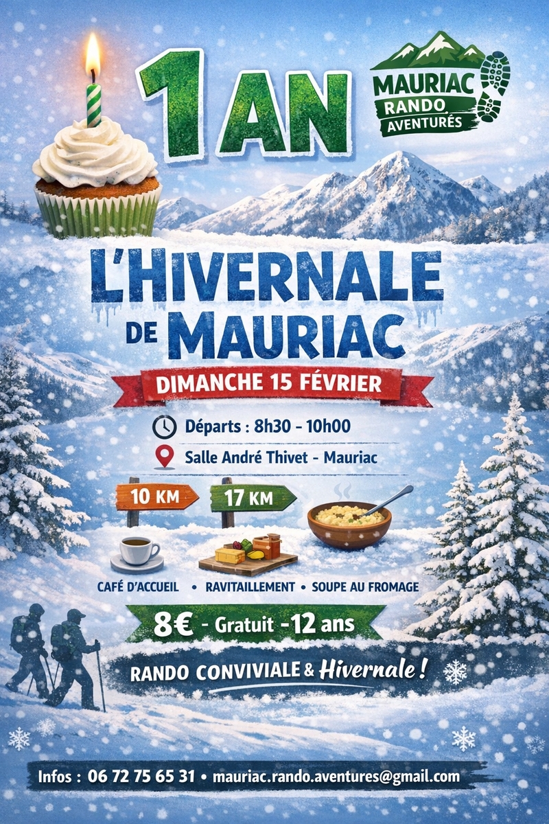 ⏳ Le dimanche 15 février 2026, à Mauriac, marcheurs, promeneurs ou traileurs, vous êtes les bienvenus pour partager une vraie rando hivernale conviviale 🥾
