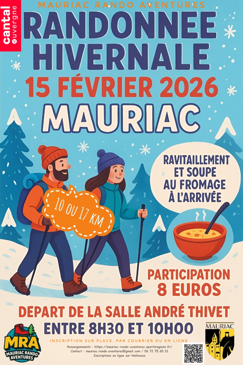 Pour la 1ère Rando Hivernale de Mauriac, on vous attend dimanche 15 février au départ de la salle André Thivet. Deux parcours pour se faire plaisir :